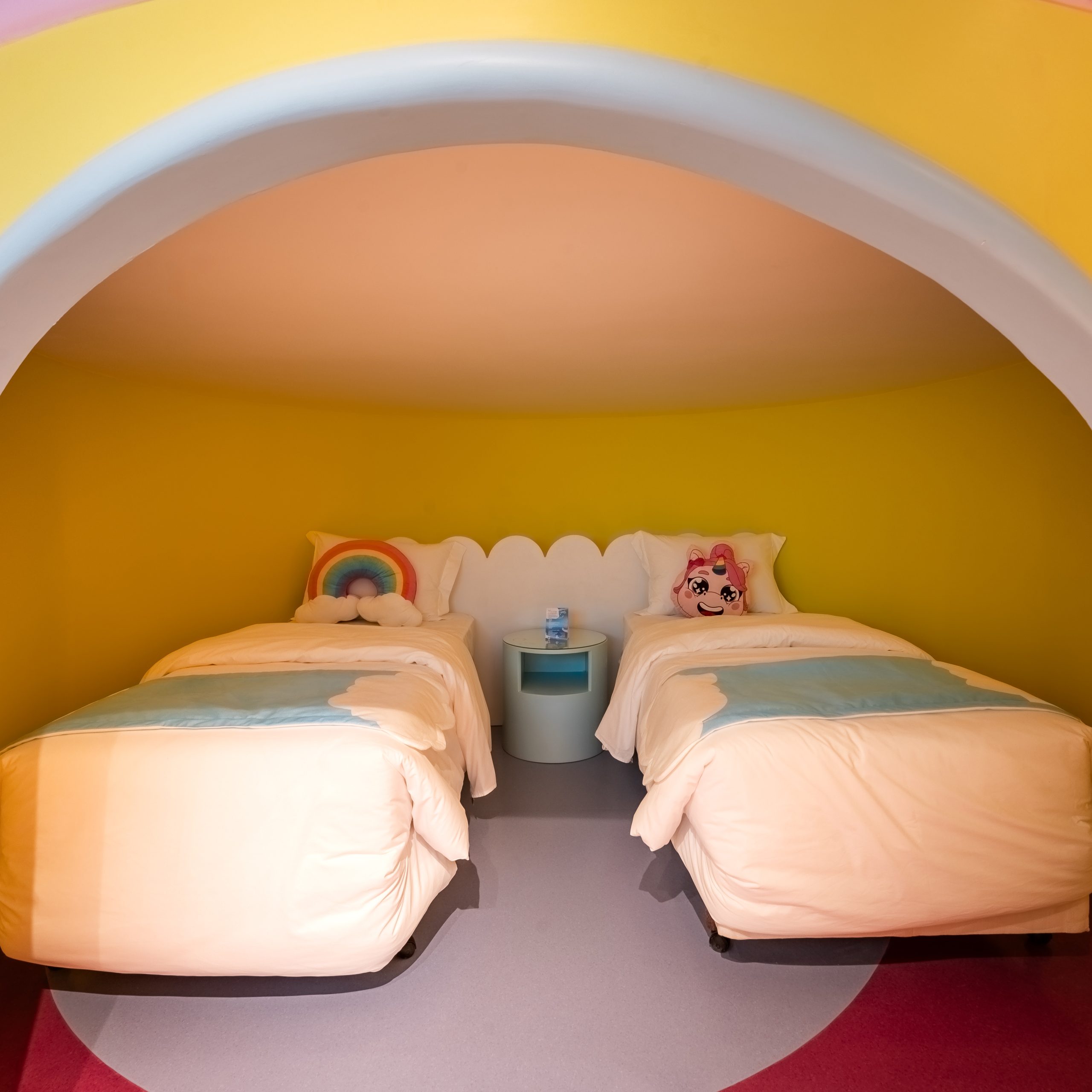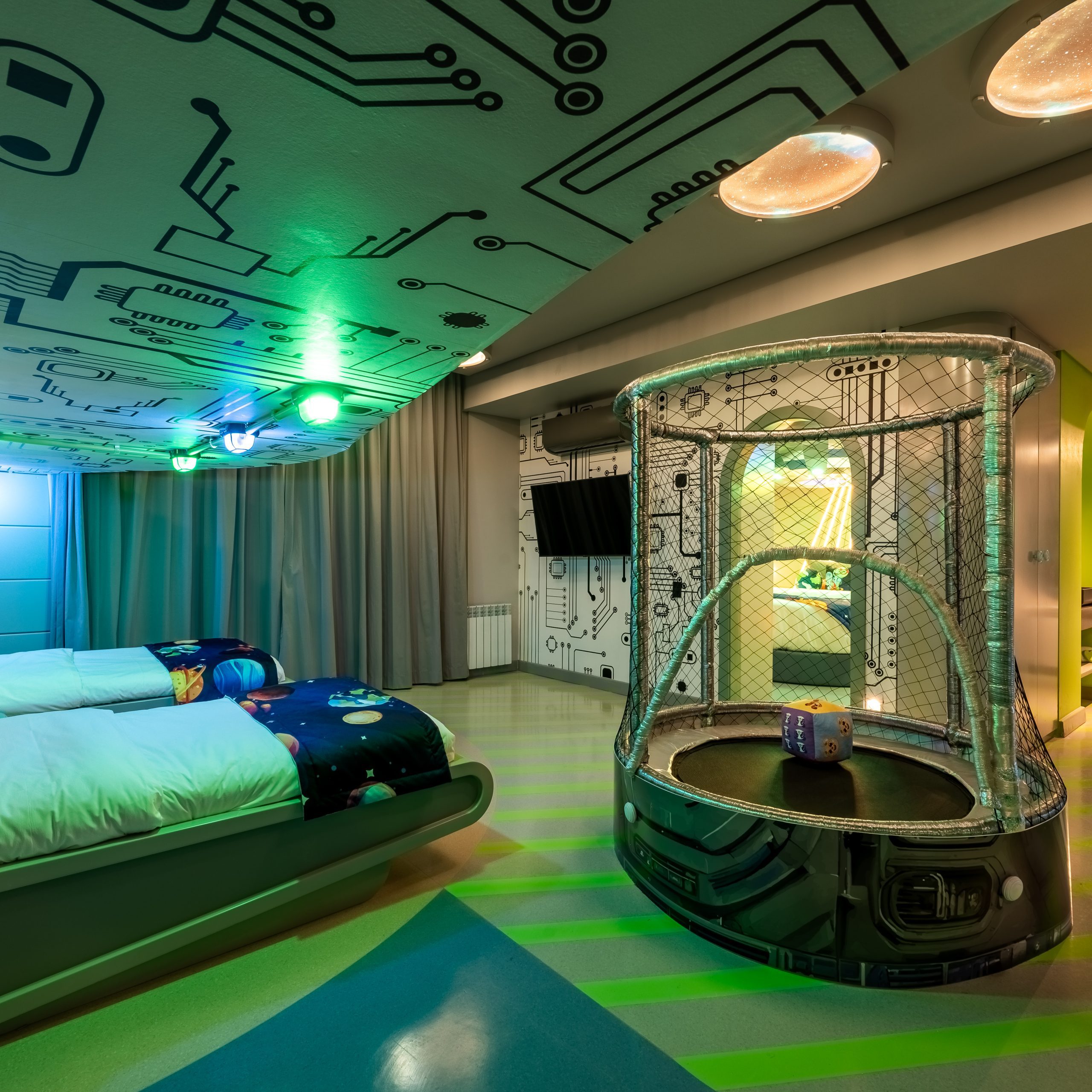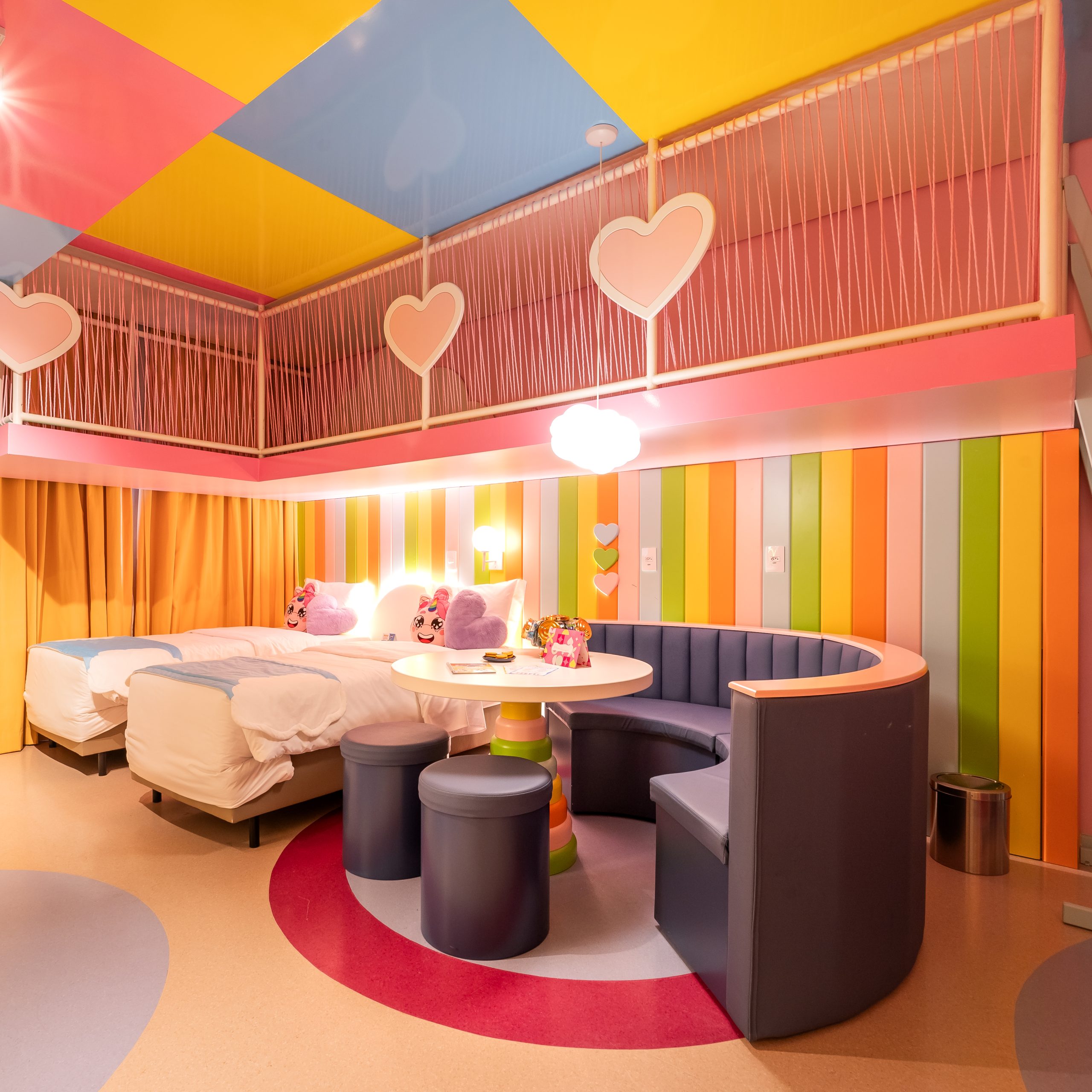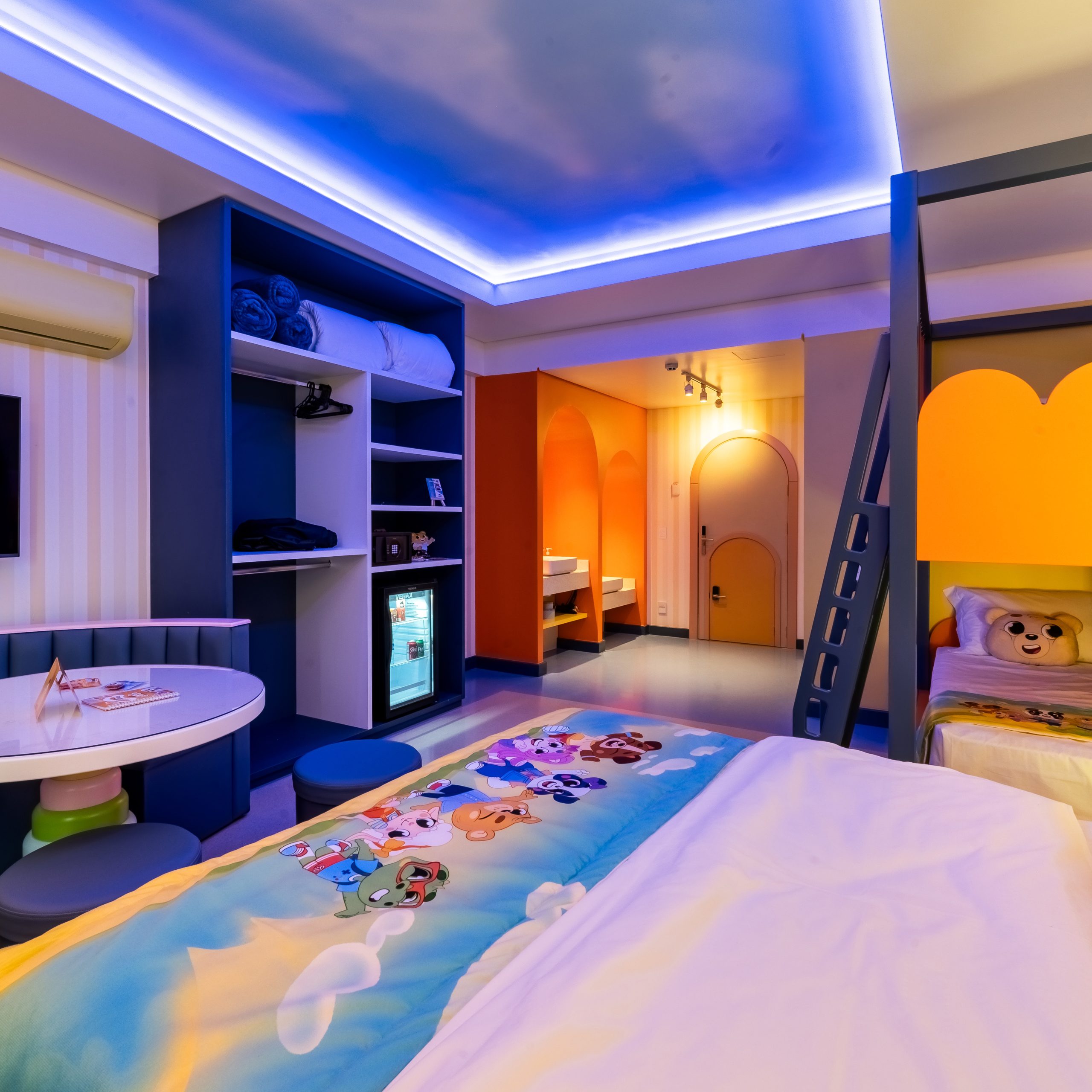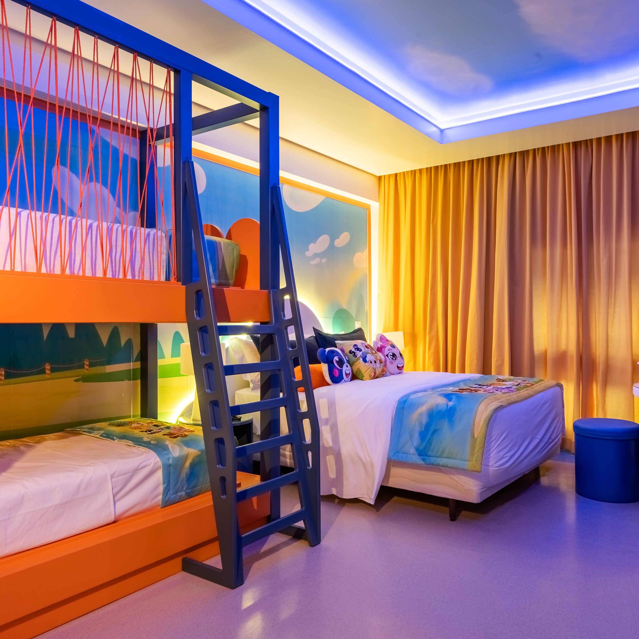 São 32 suítes plenamente temáticas, divididas em três categorias, todas equipadas com ar‑condicionado, Wi-Fi gratuito, decoração personalizada e recursos pensados para crianças — algumas suítes também são adaptadas para acessibilidade.