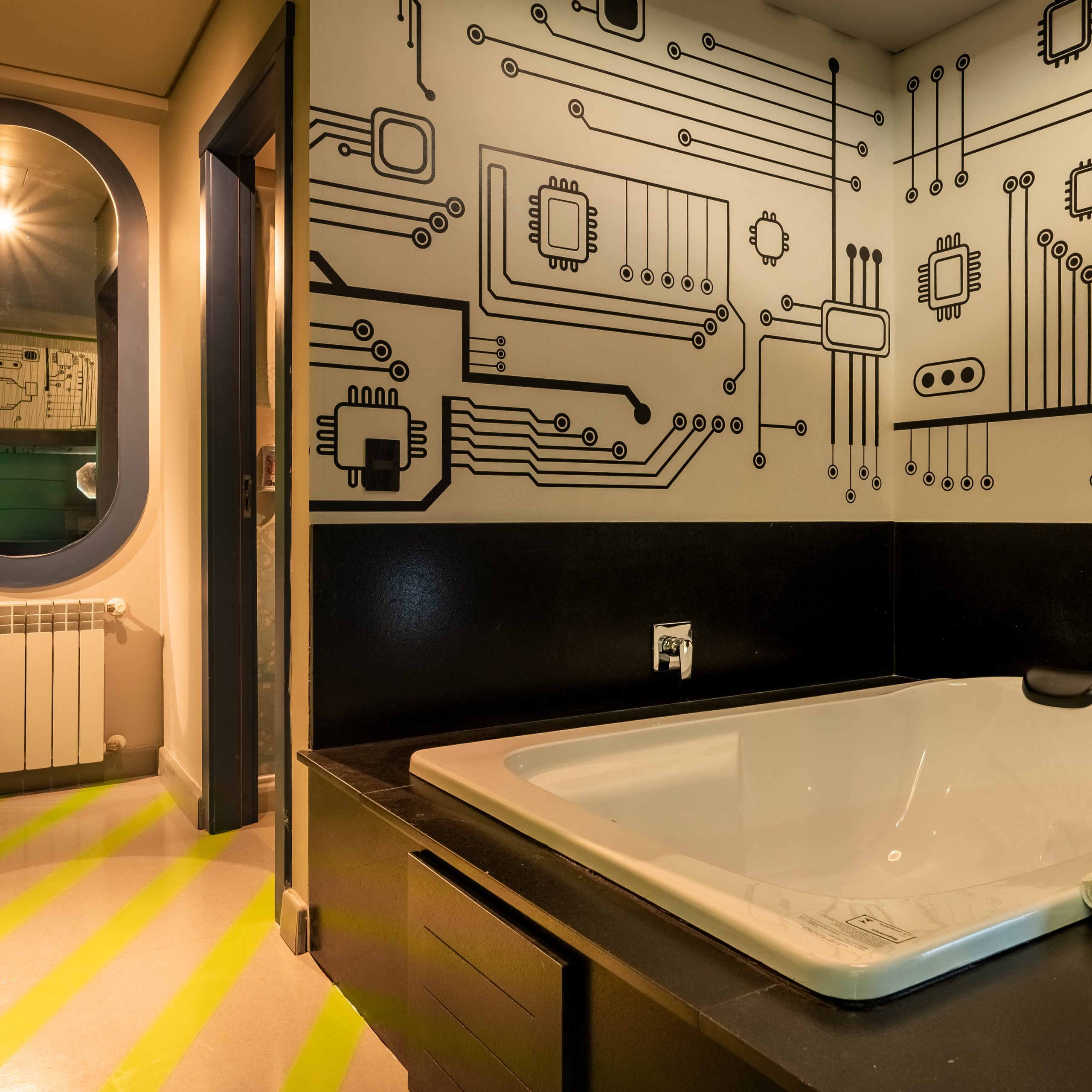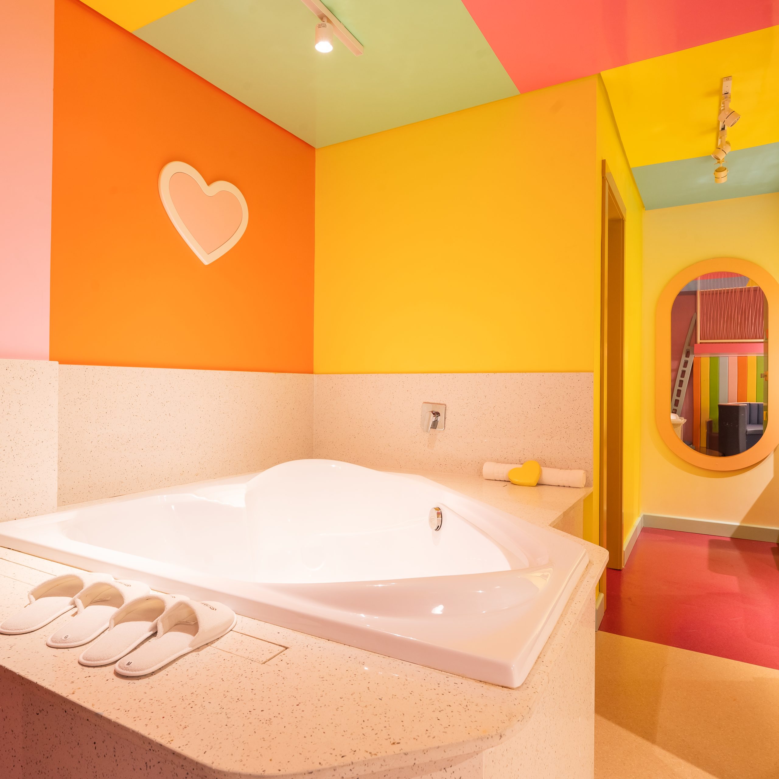 Exemplo: a suíte Unibrilho tem mezanino, dois ambientes, banheira e decoração lúdica inspirada no tema.