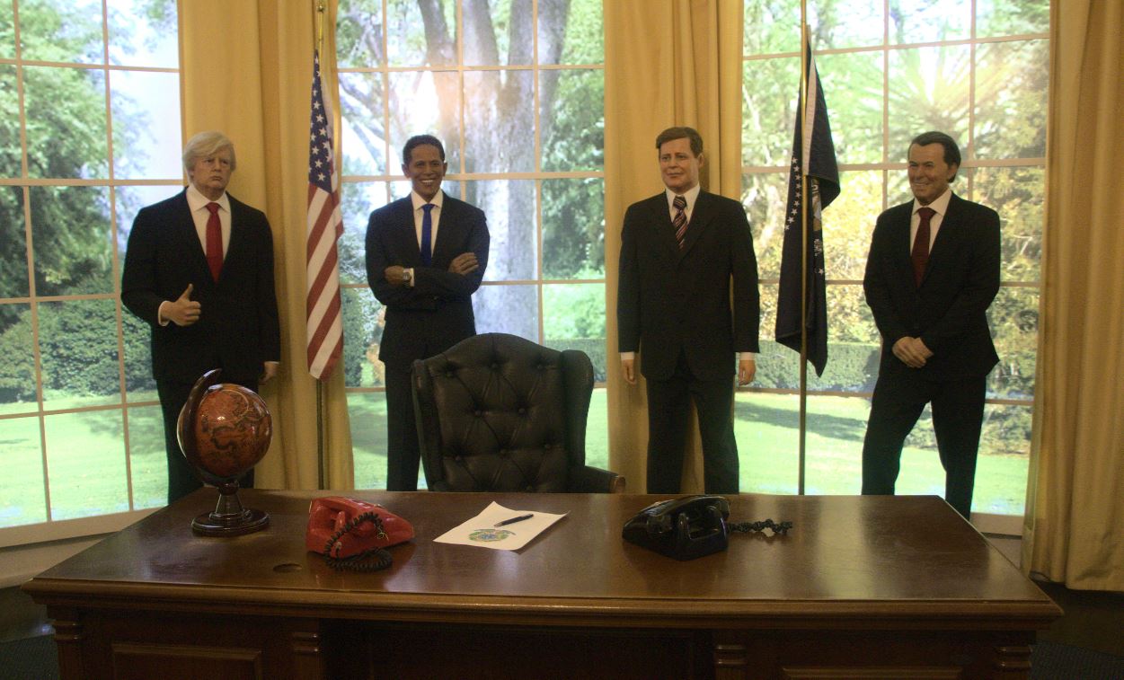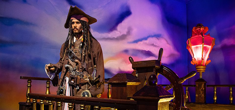 Estátuas hiper-realistas de grandes nomes da cultura mundial, como Elvis Presley, Marilyn Monroe e Jack Sparrow, em cenários temáticos cuidadosamente montados.